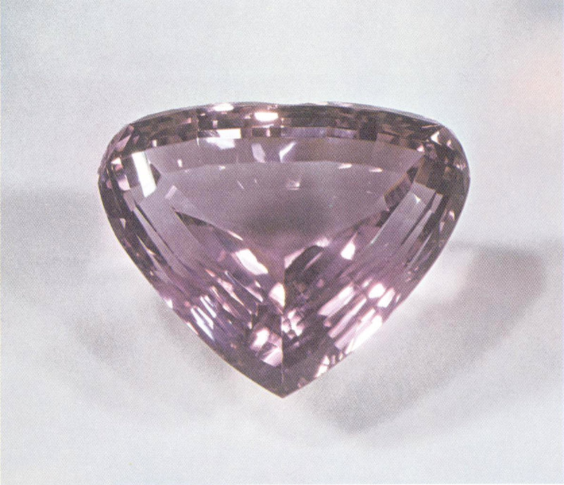 The kunzite and hiddenite varieties of spodumene show strong pleochroism, or the ability to show three different colors when viewed in the direction of different axes. Some of the large Brazilian kunzite crystals mined in the early 1960’s have 62 an intense rose-violet color when viewed along the long axis of the crystal but have pale blue-violet and pale tan colors when viewed from the other two directions. When heat treated, or exposed to strong light, this Brazilian kunzite loses its tan and bluish colors but retains the intense rose-violet. Because of spodumene’s pleochroism, the direction of cutting in the stones becomes extremely important, as it must be done in a manner that will take advantage of the violet color in kunzite and the green color in hiddenite.