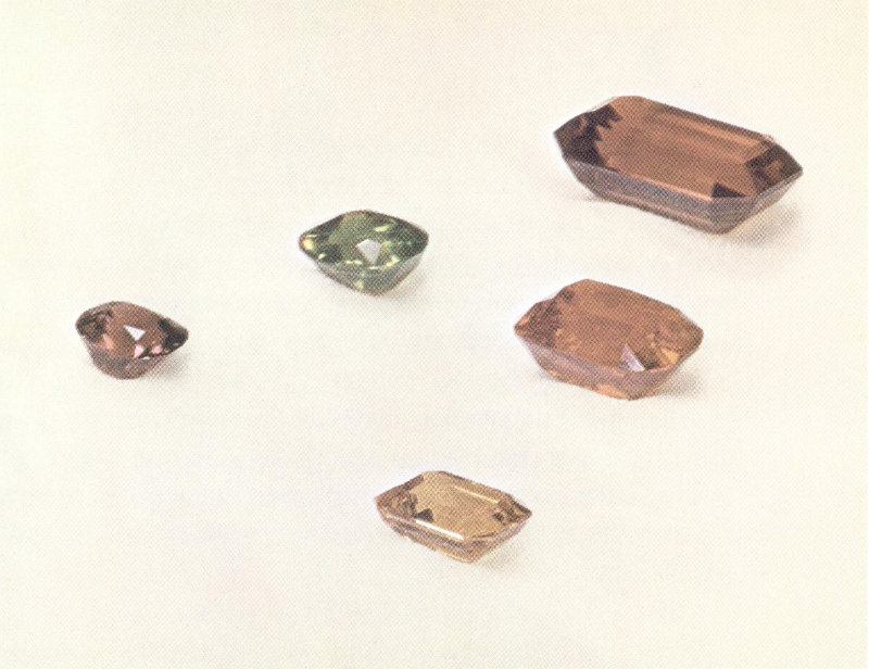 In the gem trade, the most important zircons are those that are colorless, golden brown, or sky blue. Such stones originally were reddish brown zircon pebbles from Indochina, but they have been converted by being subjected to temperatures 57 approaching 1800° F. for periods of up to two hours. When the original zircons are heated in a closed container, the stones become blue or colorless; when a flow of air is allowed through the container, the stones become golden yellow, red, or colorless. In most of these converted stones the color remains quite stable, but in some it may revert to an unattractive greenish or brownish blue after a period of time.