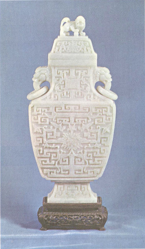 This pale green jade vase of the Ch’ien-lung period is 14½ inches high without the base. It is one of a matched pair presented as part of the Maude Monell Vetlesen collection of carved jade.