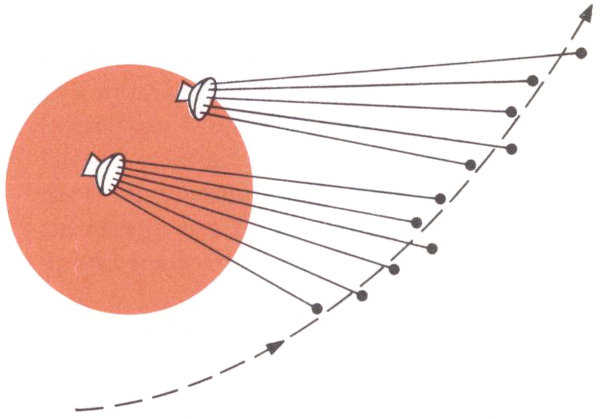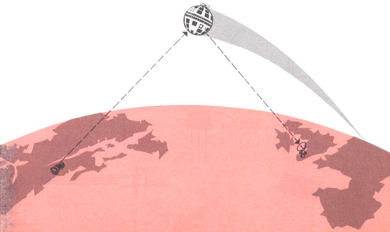 One of the attractive things about using a satellite is that it doesn’t require a revolutionary breakthrough in technical knowledge. It can employ a satisfactory means of communicating that is already available: the microwave radio relay. Today, this kind of transmission is used on a routine basis to send thousands of telephone calls and television programs across long distances. It gives high-quality performance and has a large message capacity. But there has always been one difficulty keeping us from using it for overseas communications: Extremely high frequency 13 waves can travel almost unlimited distances, but they can go only in straight lines. This means that the curvature of the earth limits a microwave’s line-of-sight path to about 30 miles; so we must build a series of transmission relay towers spaced every 30 miles or so. Obviously, this isn’t possible when you send messages across an ocean. But, if we could find a way to send a signal high up into the sky and then bounce it from there back again to a far-off spot, we could send microwave messages great distances.