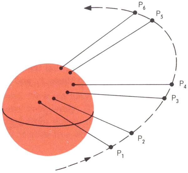 There are two other special devices: Six single solar cells are spaced at regular intervals around the satellite; these “solar aspect” indicators report the quantity of sunlight hitting them—and thus tell the direction in which the satellite is pointing. Three highly polished metal mirrors are also placed on Telstar; flashes of sunlight reflected from them can be seen in a telescope. To give a precise indication of the satellite’s position, the data obtained from both the solar aspect cells and from the flashes off the mirrors are combined.