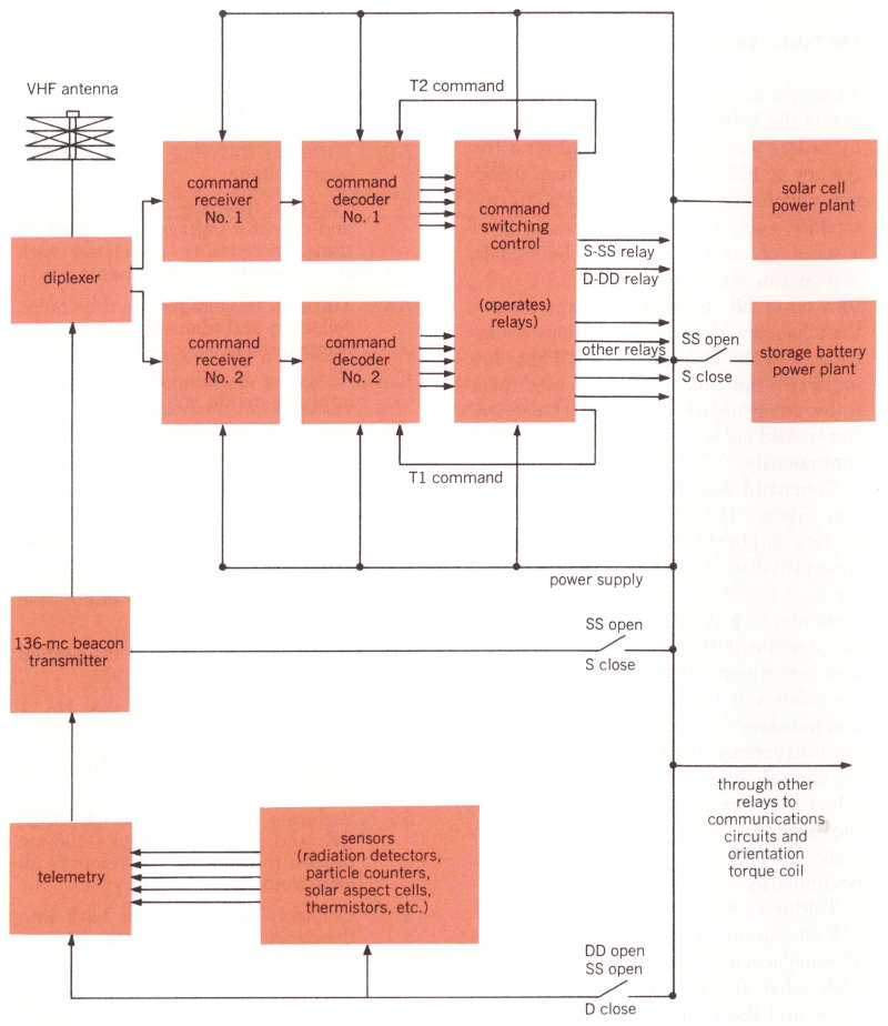 Command was the only Telstar I function that we felt had to be “redundant,” so two duplicate chains of components were provided. As you can see in the block diagram on the next page, the satellite has two radio receivers in parallel, so that one can operate if the other fails. There are also two command decoders, which take the pulse-coded signals from the receivers and translate their zeros and ones into usable instructions. In the command switching control, these instructions operate nine relays that turn on or off the power to all the electronic circuits except the command receiving chain, which operates continuously.