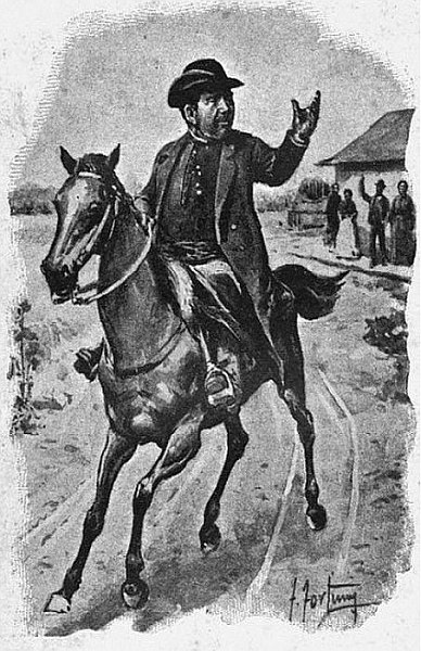 Y me quedé tomando una que otra copita con el pulpero que era un buen gallego acriollado, hasta que á eso de la diez de la maña[Pg 22]na, apareció sobre un albardón una manchita negra que iba agrandándose despacio entre el verde del campo.