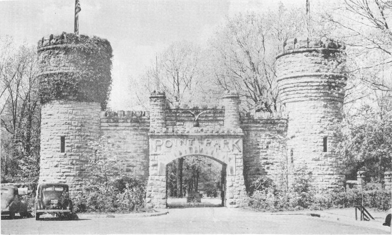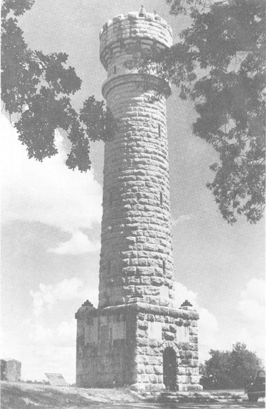 The New York Central Memorial, or Peace Monument, Point Park, Lookout Mountain, Tennessee. This is the largest and most imposing monumental structure in the park. The height is 95 feet. The base is 50 feet in diameter. The platform is reached by 7 steps which are made of Tennessee marble. There is a colonnade 3 steps above the platform. In the center of the colonnade is a pedestal on which rests the tall circular shaft. The shaft is surmounted by bronze figures of a Union and Confederate soldier with “Old Glory” towering above them. “Their hands once raised in strife, now clasping a brother’s hand.” These bronze figures are 8′ 9″ high and were designed by R. Hinton Perry of New York, to whom the idea was suggested by General Daniel E. Sickles. The pink granite in this monument came from Milford, Mass. The contractor for the granite work was G. H. Cutting Granite Co., of Worcester, Mass. The plans and specifications for the monument were prepared by A. J. Zabriskie, Engineer and Secretary of the New York Monument Commission. This monument was erected in 1907 at a cost of approximately $80,000.00. It was dedicated on November 15, 1910, with impressive ceremonies, the dedication alone costing $21,138.58. In his address on that occasion General Sickles said of this monument: