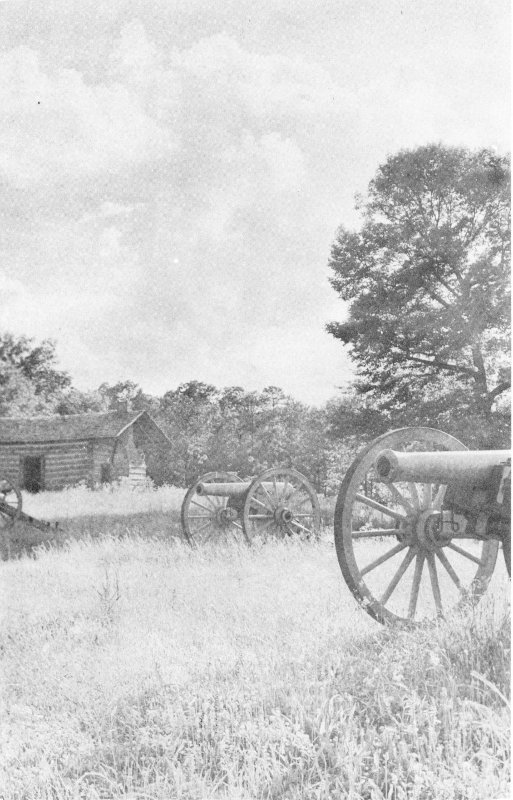 Every effort has been made to restore the battlefields to their original condition. Speaking of the shell pyramids, there are 14 of the square-base type which mark the headquarters sites of either an army corps or the field headquarters of the commanding general. There are 8 of the triangular-base pyramids which mark the exact spot where each of the brigade commanders lost their lives. All of these are located on the Chickamauga battlefield. On Missionary Ridge, a bronze cannon-ball monument has been substituted for a pyramid. This also marks the site where a brigade commander lost his life. One original house stands on the Chickamauga battlefield; also three replicas of the original.