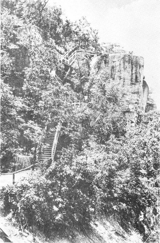 The withdrawal of the Confederates from Lookout Mountain left the Union forces in complete control of this point. At sunrise on the morning of the 25th, there were volunteers from the 96th Illinois and 8th Kentucky Infantry who scaled the rock palisades and reached the top of the mountain. They moved to the extreme northern point where they planted their flag of victory. A series of stairways has been erected to mark the exact route by which these Union troops climbed out on top of the mountain.