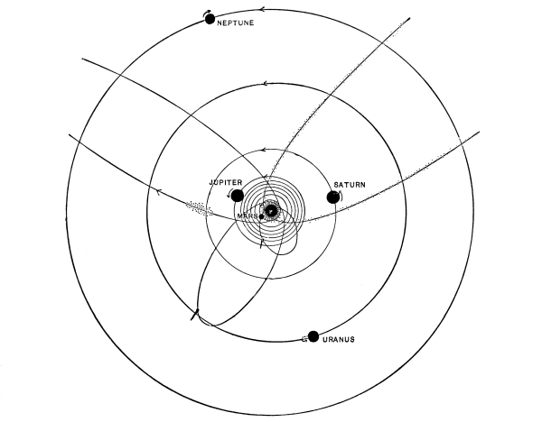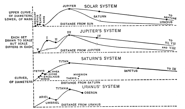 See has recently shown (Astr. Nach. No. 4341-42) that a particle moving through a resisting medium under the attraction of two bodies revolving round one another in circles may eventually be captured by one of them though originally under the domination of both. The argument consists in introducing the effect of a resisting medium upon [Pg 252] the motion in the space permitted by Jacobi’s integral, following Darwin’s examination of this space. In the actual case of nature the effect is much more complicated, and at present is not capable of exact solution for masses other than indefinitely small, even supposing circular orbits for the chief bodies. It may, however, explain the curious relation shown in the arrangement of the direct and retrograde movement of satellites. [Pg 253]