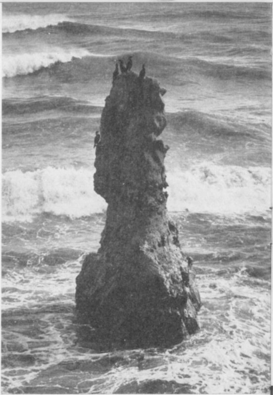 Surf and sea-fowl, cliffs and rocky islets, characterize Monterey and Santa Cruz areas. View above is from Lighthouse Point, Santa Cruz.