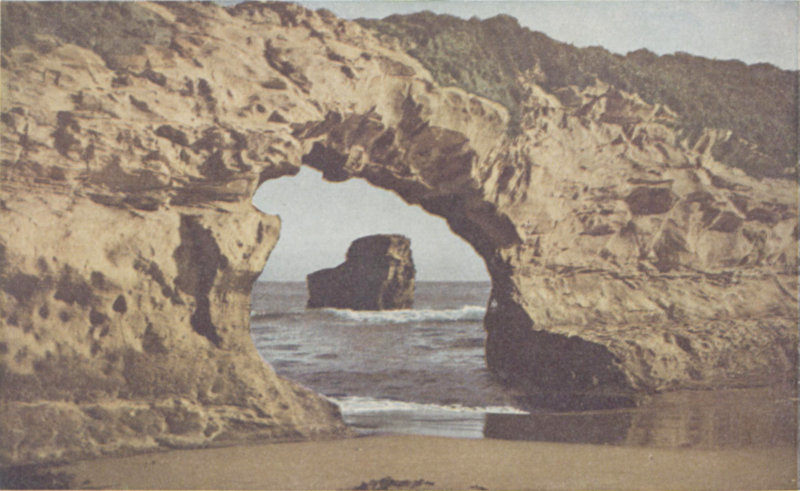 In the city of Santa Cruz itself is Natural Bridges State Park, a notable example of erosion, and along the coast in Santa Cruz County are six other state parks—Seacliff Beach, where a World War I concrete freighter is used for a fishing pier and a fine road parallels the cliffs; Sunset Beach, with a high lookout and picnic ground under twisted cypresses; Capitola Beach, where there is a 7 special pool for small fry; New Brighton Beach, Manresa Beach and Zmudowski Beach. At some of these campsites are available.