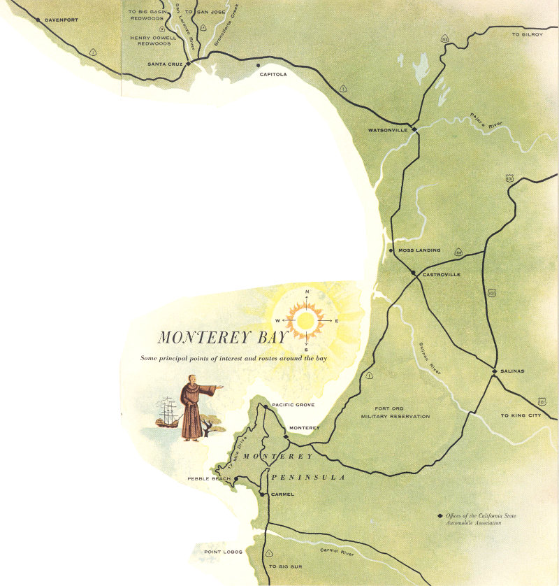 ILLUSTRATIONS—Photographs: Cover, pages 2 and 3, Art Malquel, Santa Cruz. Inside front cover, pages 12, 13 (top and center), 16, Wynn Bullock, Monterey. Pages 4 and 5, courtesy The Seaside Company, Santa Cruz. Pages 6 (center and bottom), 8, 9 (bottom), Ed Webber, Santa Cruz. Pages 6 (top), 10, 14 (center), Mike Roberts, Berkeley. Pages 9 (top), 13 (bottom), Rey Ruppel, Monterey, courtesy Monterey Chamber of Commerce. Page 11 (left), California Spray-Chemical Co. Page 11 (right), Cal-Pictures Inc., San Francisco. Pages 14 (top), 15, Josef Muench, Santa Barbara. Page 14 (bottom), Julian P. Graham, Pebble Beach. Page 17, Ansel Adams, San Francisco, courtesy American Trust Company.
