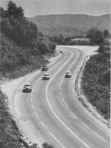 Main avenue of approach to Santa Cruz is this fine highway from Los Gatos. Curving gently through the Santa Cruz Mountains, it brings to view a wealth of lovely scenes. Under construction is a by-pass which will take its traffic off Los Gatos’ streets.