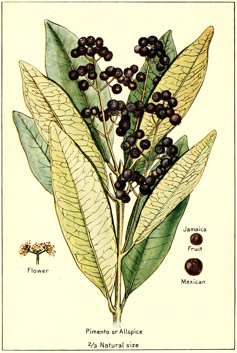 The Pimento (Pimenta officinalis), an evergreen tree belonging to the Myrtle family, is a native of the West Indies, but is found in Mexico, Costa Rica and Venezuela as well. The highest quality Pimento comes from the Island of Jamaica. The Mexican berry, while handsome in appearance, is inferior in flavoring quality.