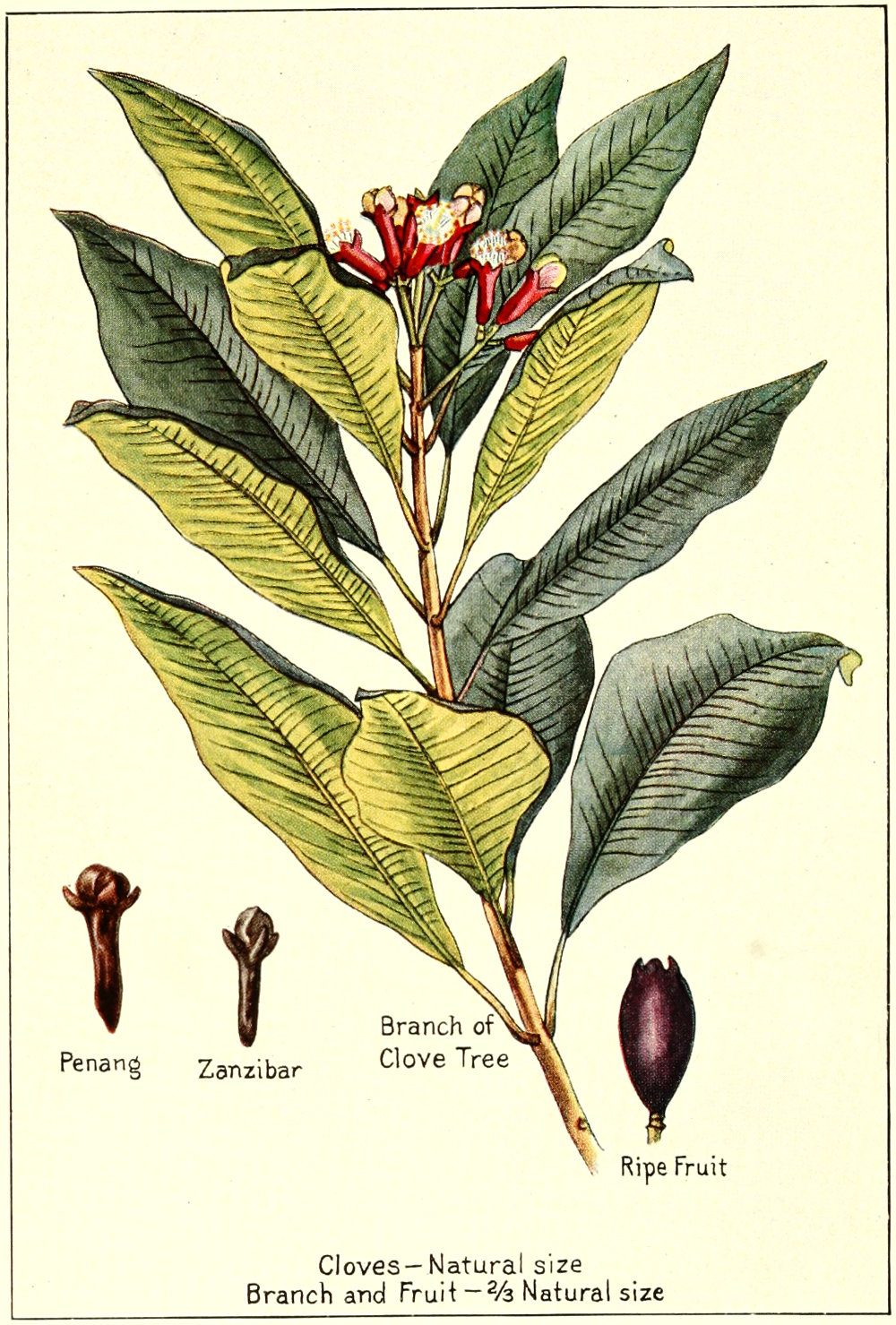 Cloves are the dry flower-buds of an evergreen (Caryophyllus, Aromaticus or Eugenia caryophyllata) belonging to the Myrtle family, averaging in height twenty to forty feet. The Clove-tree is cultivated in Ceylon, India, Mauritius, the West Indies and Zanzibar. The different varieties derive their names from the district of origin or the city of exportation. Cloves from Amboyna, Penang and Zanzibar are perhaps best known and are in greatest demand.