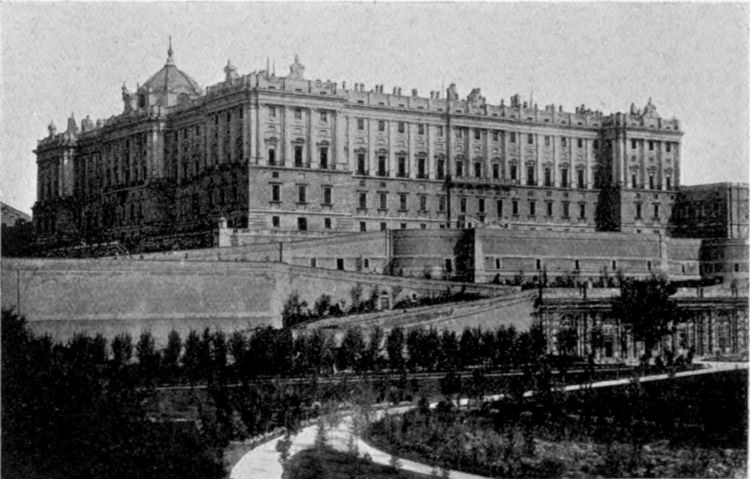 Spain is beyond question the richest country in the world in the number of its Royal Residences, and while few are without artistic importance, all are rich in historical memories. Thus from the Alcazar at Seville which is principally associated with Pedro the Cruel, to the Retiro, built to divert the attention of Philip IV. from his country’s decay; from the Escorial, in which the gloomy mind of Philip II. is perpetuated in stone, to La Granja, which speaks of the anguish and humiliation of Christina before Sergeant Garcia and his rude soldiery; from Aranjuez to Rio Frio, and from El Prado, darkened by the agony of a good king, to Miramar, to which a widowed Queen retired to mourn: all the history of Spain, from the splendid days of Charles V. to the present time, is crystallised in the Palaces that constitute the patrimony of the crown.