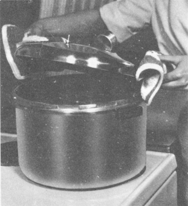 Before using the canner, wash the kettle well. Do not put cover with dial gage in water. Wipe the cover carefully with a hot soapy cloth; repeat with a clean damp cloth. Dry. Keep the petcock and safety valve clear. Before each use of the canner, inspect these openings. To clean, draw a string or narrow strip of cloth through the petcock.