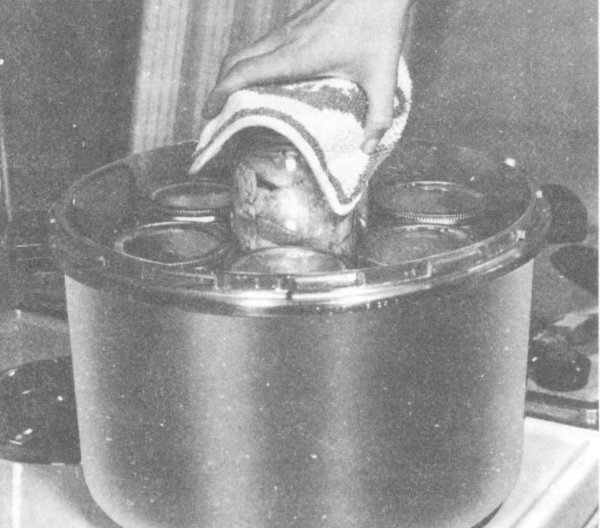 Glass jars (air exhausted).—Pack jars to 1 inch of top. To exhaust air, cook raw poultry in jars at slow boil to 170° F., or until medium done (about 75 minutes). (See p. 9.) Add salt if desired: ½ teaspoon per pint or 1 teaspoon per quart. Adjust lids. Process in a pressure canner at 10 pounds pressure (240° F.)—