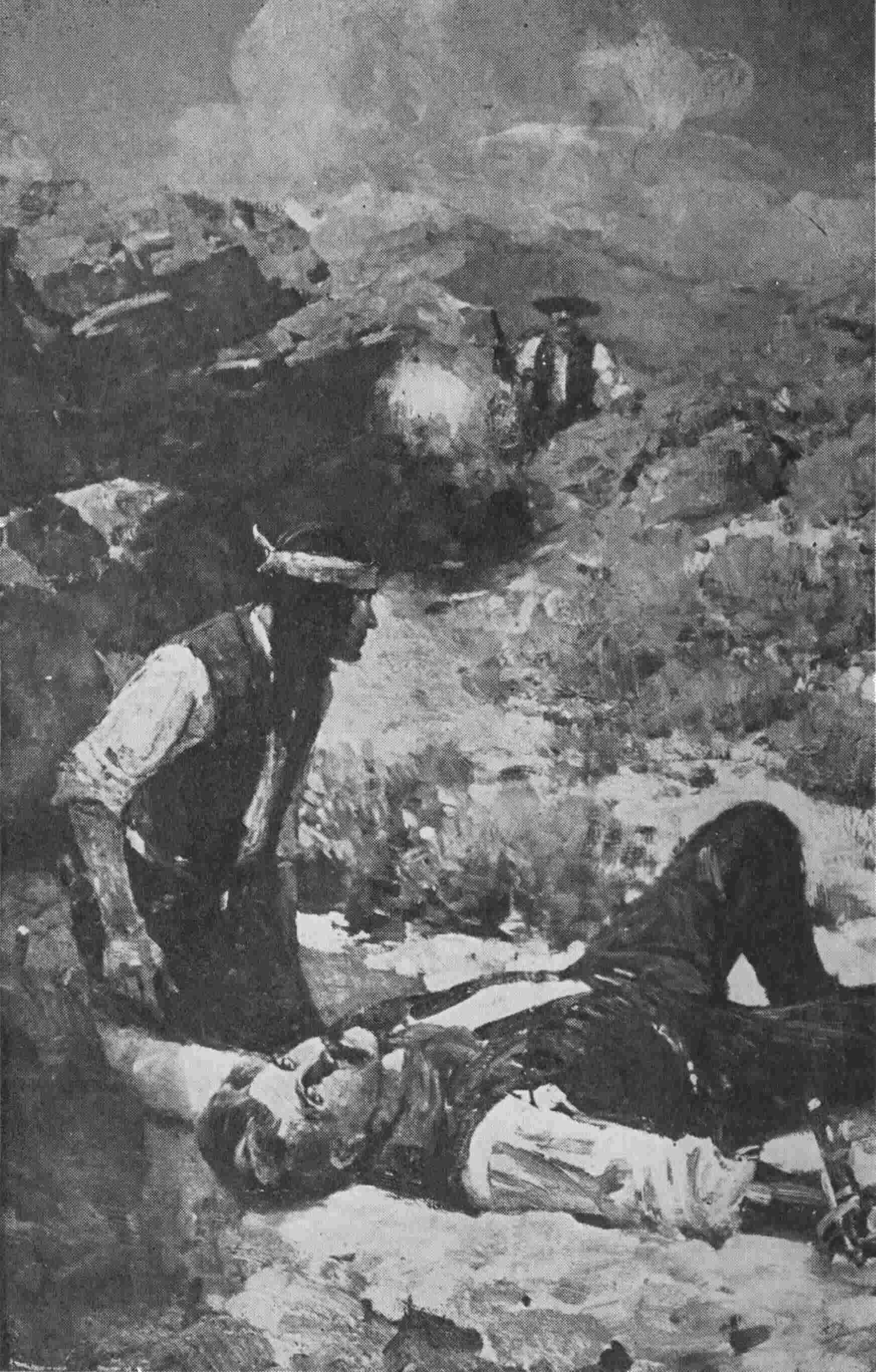 “There are many,” Johnny paused to say cautiously before his hand moved onward. Was there any one else up there to answer him—Scanlon, Doc, Kelsey? God help him if there was not. An eternity passed for the boy as his hand started again and moved a foot without receiving an answer. Johnny knew that he was taking the supreme gamble of his life. Another few inches his hand moved, and then bang, bang, bang came the report of a gun.
