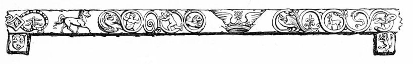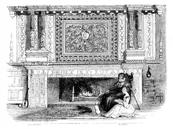[202] Among other embellishments of the “great chamber of state,” was a most sumptuous Chimney-piece, composed of alabaster or marble, richly carved and gilt. It was usually of very large dimensions, widely spread, and reaching from the floor to the ceiling. There were sometimes statues placed within columns and niches, which represented some of the cardinal virtues, or grotesque termini, in the Roman manner, then lately introduced into this country. The whole was painted with gaudy colours; and the armorial bearings of the family, in one large escóchéon, or the quarterings dispersed into many others, were an indispensable decoration. In certain instances, the chimney-piece was of carved freestone, left plain. The almost perfect resemblance of these to the superb monuments which in that age were dedicated to the memory of the dead, leave no doubt that the original idea had the same analogy. Of this opinion one most splendid instance will suffice—that of the mausoleum of Robert Dudley, Earl of Leicester, in the Beauchamp Chapel, Warwick, and the CHIMNEY-PIECE (see preceding Woodcut) of Kenilworth Castle.—Dallaway’s Discourses, page 363, 364.