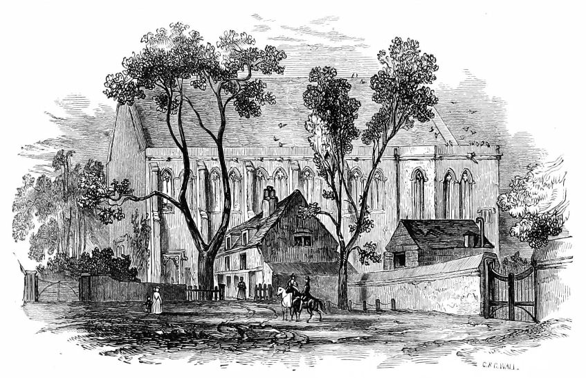 [222] A dark vaulted structure of two divisions connected with the Convent Garden, is all that remains of the old Abbey House, the residence of the Dennys; even the large mansion erected on its site, of which a view is given in Farmer’s History of Waltham Abbey, has been long demolished. In the Convent Garden, which is now tenanted by a market-gardener, there is a tulip-tree, remarkable equally for its magnitude and antiquity. The Abbey mills are still used as a cornmill.
