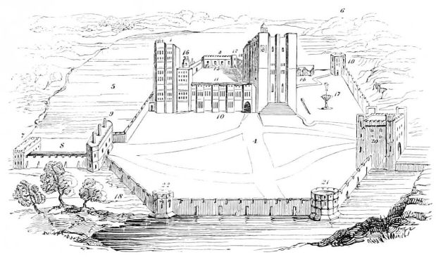 | The Interior Quadrangle of the Castle from the Keep, showing its present condition, as restored by the late Duke of Norfolk | Archer. | Evans. | 7 |