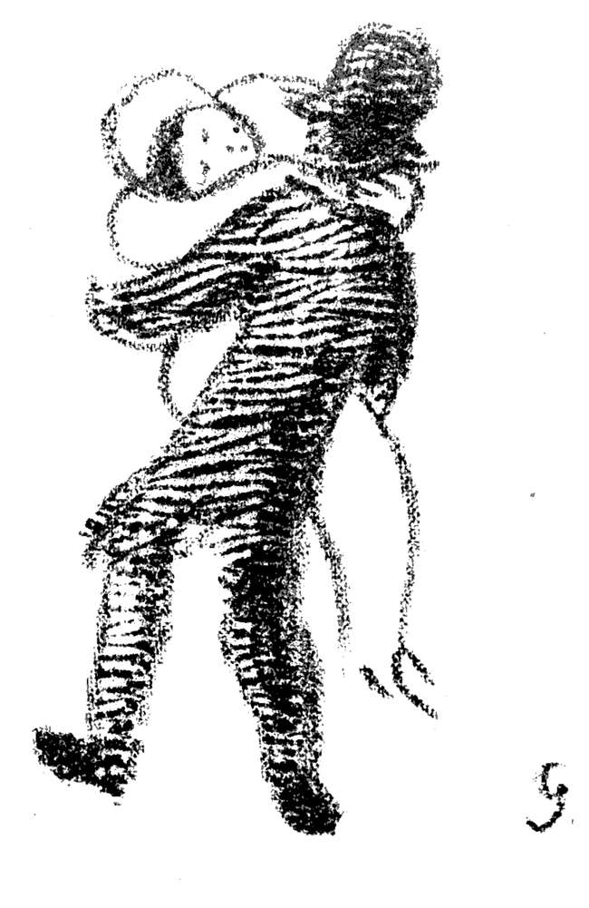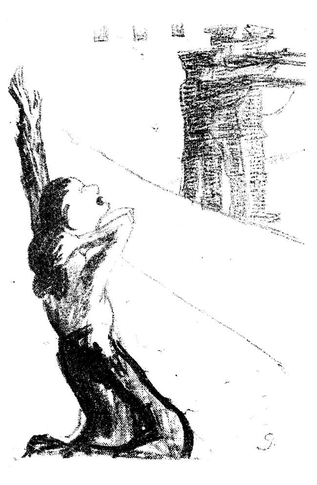 „Wo ist die Lady?“ herrschte er sie an. Ein teuflischer Blick der Negerin traf ihn. „Schonen Sie sie, wenn Sie ein Gentleman sind,“ schrie sie und schlang, während sie die Portiere aufriß, einen großen schwarzen Shawl um ihre Gebieterin. „Marsch,“ schrie Capt. Pound, und da die völlig zusammengebrochene Frau ihn irgendwo verwirrte, stampfte er mit dem Holzfuß wie ein Verrückter auf den Boden. Sein eleganter Athletenkörper mit dem verwüsteten Gesicht sah aus wie ein Teufel, den einer der jungen Maler dieser Zeit geschildert hat, die von der Natur verflucht waren, die Dinge in höllischen Verzerrungen zu sehen. Er hielt die Pistole immer wieder zur Seite nach rückwärts und beobachtete beide mit einem flackernden Auge.