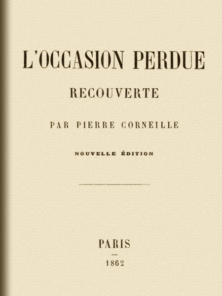 Nous regrettons que M. J. Taschereau, dans son Histoire de la vie et des ouvrages de P. Corneille (Paris, P. Jaunet, 1855, in-12), n’ait fait qu’analyser la dissertation de Michault sur l’Occasion perdue recouverte: en étudiant la question lui-même, et en y appliquant l’esprit de critique qui distingue ses travaux de littérature, il serait arrivé, nous n’en doutons pas, aux conclusions que nous allons soumettre à son jugement éclairé et consciencieux.