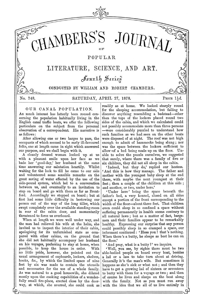 ‘As for children being born in the cabins, sir, I know several women who have had large families all born on board the boat while it was making its voyage, with perhaps nobody at all to attend on them except their husband, or some woman from another boat which chanced to be working mates with them.