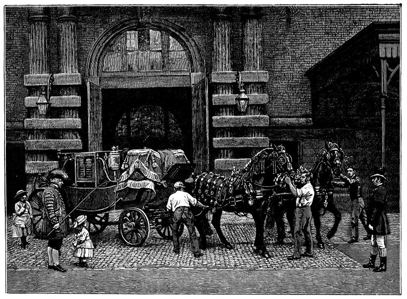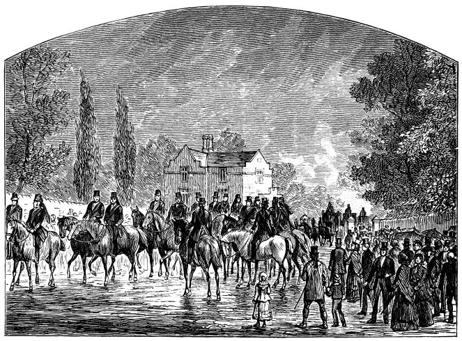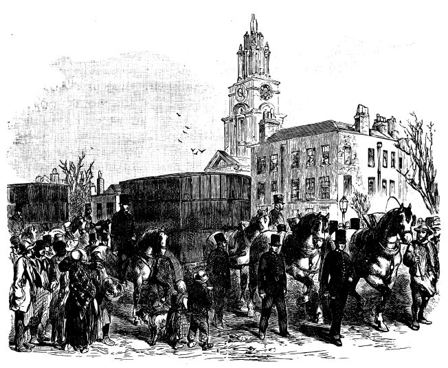 [282] A few days before this event, on the 10th inst., the Royal Nursery was robbed. The Royal Household is, of course, under the control of the Lord Steward. One of his sub-departments is called “The Silver Pantry,” which has three yeomen, one groom, and six assistants attached to it. Yet, when the nursery plate had to be sent to Windsor, these gorgeous functionaries, with their staff of porters, horses, grooms, and carts, could not condescend to convey it. It was trusted to a common carrier, who unhappily, when on his way, stopped at a public-house for refreshments. He and his men were “only absent for five minutes,” but in that time a light spring cart had driven up to the carrier’s waggon, and when it drove away, the box containing the Royal nursery plate had vanished. The plate chest was found in Bonner’s Fields containing everything but the bullion. The knife-blades and packing, which latter consisted of women’s dresses, were found, but the plate was never traced.