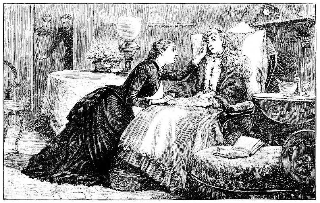 RHODA’S sitting-room was very warm and pleasant and quiet, the safest and most comfortable place—the fire lighting it up with fitful gleams, the windows still glimmering between the curtains with the dim twilight which had not turned to dark, the pictures and mirrors on the walls giving forth gleams of ruddy reflection. There were no longer flowers outside to brighten the prospect, but within groups of plants in every corner, and a tall pot of creamy, fragrant narcissus spreading its delicate spring scent through the room. The warm flicker of the firelight seemed to draw out the sweetness of the flowers, the deeper tints of colour, the reds and browns of the furniture. There could not have been a woman’s apartment more entirely breathing of women, and{370} of comfort, and tranquillity, and peace. Hetty lay on the sofa near the fire, the ruddy glow shedding a pink colour over her still pale face. Rhoda sat at her feet, leaning against the sofa, holding up her eager little face, asking questions in her eager way about Hetty’s home, about the children, about baby, who was so funny. “Oh! I wish I could see him. Oh, I wish I could go and play with them all!” Rhoda said. Hetty, who had been removed here in her mother’s absence to join the little party once more, in the sweetness of that convalescence, which was almost more than coming back to health, lay smiling, answering the child’s questions in a little broken voice of weakness and happiness. Miss Hofland sat on a low chair by the fire, going through her usual little calculations, setting down all the comforts on one side against the very curious condition of this house on the other. All these things that had happened were very mysterious. The whispers of the maids, which could scarcely fail to reach her, were full of suggestions. It was not pleasant to live in a house where such strange things were{371} heard and seen; but then, on the other hand, it was very comfortable. There was scarcely anything one wanted that one could not have. In some families the treatment was very different. She was putting these things meditatively against one another when the servant came in with the lamp. There was an abundant supply of light, as of everything else—no stint of anything—lamps and candles, it did not seem to matter how many were used. It was very comfortable, enough to make up for the many unpleasant circumstances which did not after all touch either her pupil or herself.
