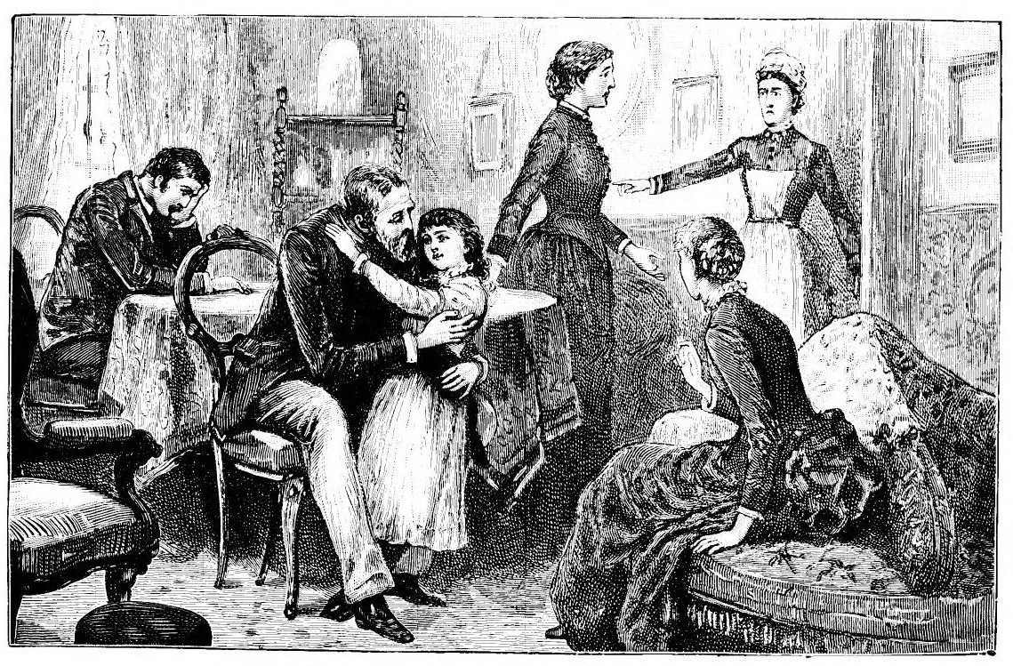 “Father, here I am!” cried little Rhoda, one arm clasping his, one uplifted in defence.