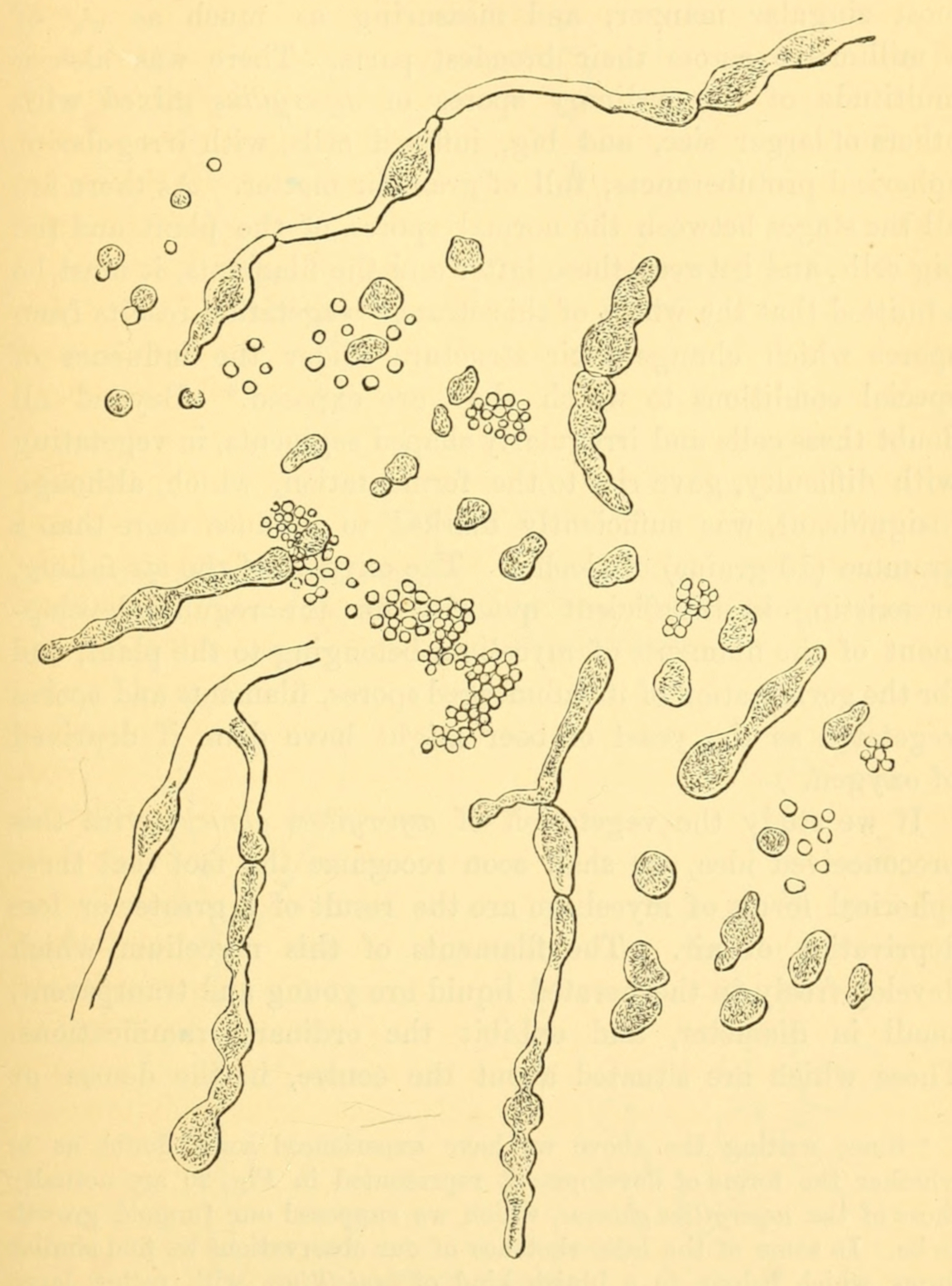 5No. 1 of the engraving represents the ferments of turned beer, as it is called. These are filaments, simple or articulated into chains of different size, and having a diameter of about the thousandth part of a millimetre (about 1/25000 inch). Under a very high power they are seen to be composed of many series of shorter filaments, immovable in their articulations, which are scarcely visible.
