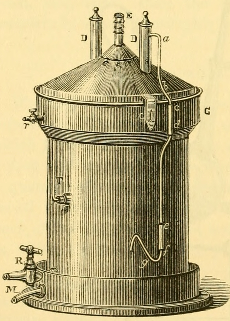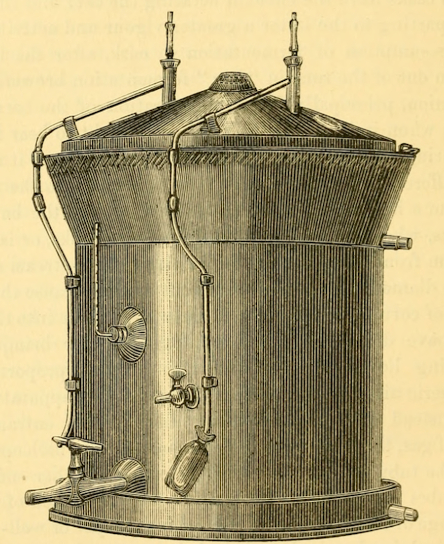 181. This arrangement limits the proportion of oxygen that may be introduced into the wort by direct oxidation. But it would be easy to increase this at will, by causing the wort as it comes from the copper and the hop-back to pass into a cylinder turning horizontally on its axis and furnished with blades fixed inside, so as to divide the wort and bring it better into contact with the air in the cylinder. Instead of a revolving cylinder we might use a fixed vessel, in which the wort could be stirred up by some arrangement outside. In either case we should have to take care that the air was pure when it came into contact with the wort, but this would be a matter of no difficulty; we would simply have to make communication with the outer air by means of a tube filled with cotton wool. Any air that might be in the vessel at the moment when the wort was introduced would be purified by the high temperature of the wort coming from the copper. We should, moreover, gain the great advantage of being able to bring oxygen to bear on our wort in determinate amounts. From this vessel it would pass on to the refrigerator. We might again raise the wort oxidized on the coolers to a temperature of 75° C. (167° F.), to recool it in this manner and aerate it by means of the pure-air pipe.