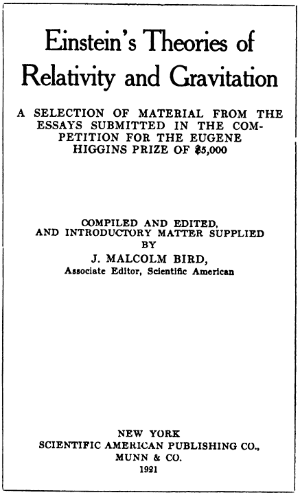 In laying down a set of general principles to govern the award of the prize, one of the first things considered by the Judges was the relative importance of the Special and the General Theories. It was their opinion that no essay could possibly qualify for the prize which did not very distinctly [ix]give to the General Theory the center of the stage; and that in fact discussion of the Special Theory was pertinent only so long as it contributed, in proportion to the space assigned it, to the attack upon the main subject. The same principle has been employed in selecting essays for complete or substantially complete reproduction in this volume. Writers who dealt with the Special Theory in any other sense than as a preliminary step toward the General Theory have been relegated to the introductory chapters, where such excerpts from their work have been used as were found usable. The distinction of publication under name and title is reserved for those who wrote consistently and specifically upon the larger subject—with the one exception of Dr. Russell, whose exposition of the Special Theory is so far the best of those submitted and at the same time so distinctive that we have concluded it will appear to better advantage by itself than as a part of Chapters III. and IV.