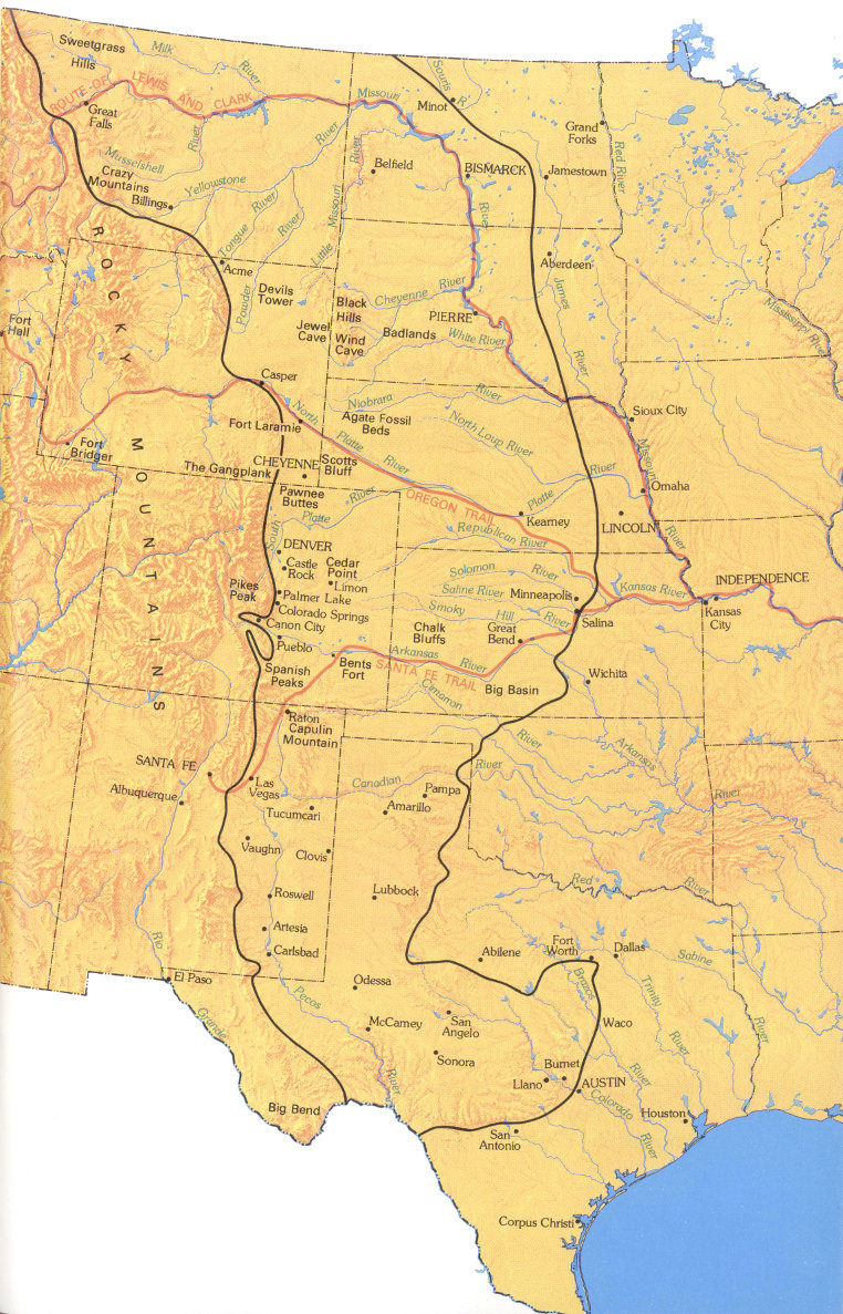 For more than half a century after Lewis and Clark crossed the country in 1805-6, the Great Plains was the testing ground of frontier America—here America grew to maturity (fig. 1). In 1805-7, explorer Zebulon Pike crossed the south-central Great Plains, following the Arkansas River from near Great Bend, Kans., to the Rocky Mountains. In later years, Santa Fe traders, lured by the wealth of New Mexican trade, followed Pike’s path as far as Bents Fort, Colo., where they turned southwestward away from the river route. Those pioneers who later crossed the plains on the Oregon Trail reached the Platte River near the place that would become Kearney, Nebr., by a nearly direct route from Independence, Mo., and followed the Platte across the central part of the Great Plains.