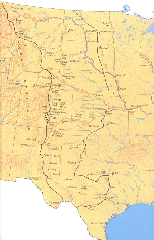 Geographically, the Great Plains is an immense sweep of country; it reaches from Mexico far north into Canada and spreads out east of the Rocky Mountains like a huge welcome mat. So often maligned as a drab, featureless area, the Great Plains is in fact a land of marked contrasts and limitless variety: canyons carved into solid rock of an arid land by the waters of the Pecos and the Rio Grande; the seemingly endless grainfields of Kansas; the desolation of the Badlands; the beauty of the Black Hills.