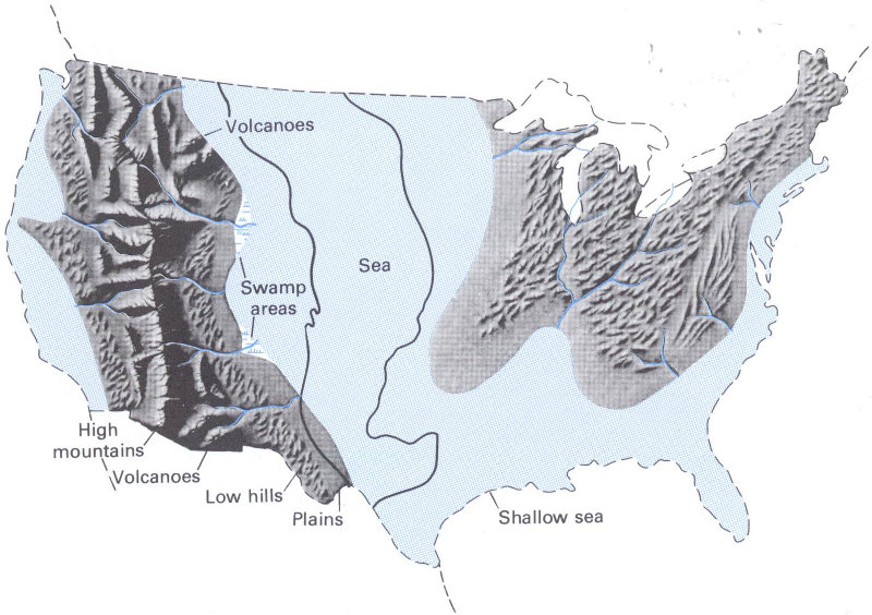 Figure 6.—Generalized paleogeographic map of the United States in Late Cretaceous time (65 to 80 million years ago), when most of the Great Plains was beneath the sea.