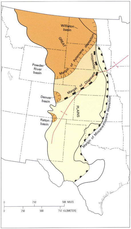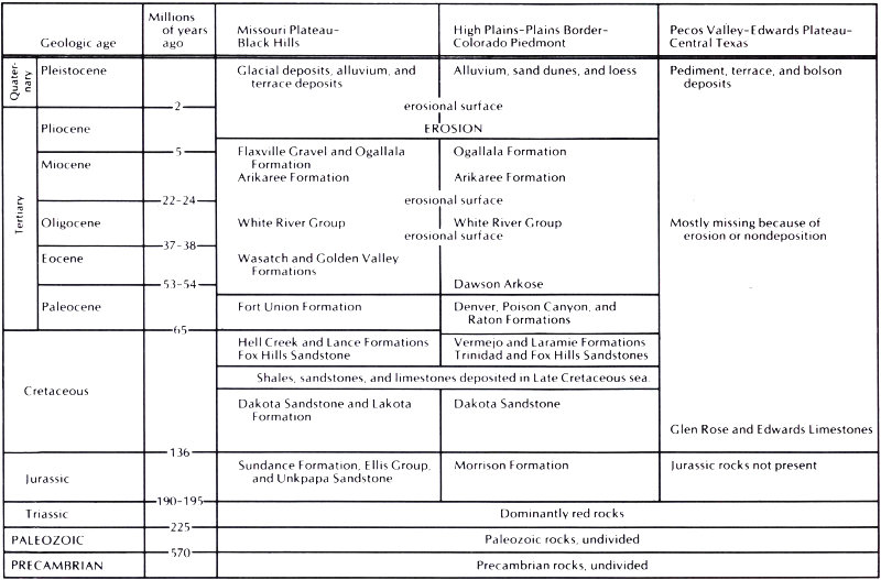 | Geologic age Millions of years ago | Missouri Plateau—Black Hills | High Plains—Plains Border—Colorado Piedmont | Pecos Valley—Edwards Plateau—Central Texas |