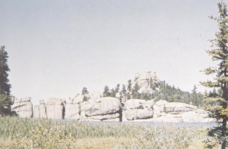 The Black Hills is a huge, elliptically domed area in northwestern South Dakota and northeastern Wyoming, about 125 miles long and 65 miles wide (fig. 10). Rapid City, S. Dak., is on the Missouri Plateau at the east edge of the Black Hills. Uplift caused erosion to remove the overlying cover of marine sedimentary rocks and expose the granite and metamorphic rocks that form the core of the dome. The peaks of the central part of the Black Hills presently are 3,000 to 4,000 feet above the surrounding plains. Harney Peak, with an altitude of 7,242 feet, is the highest point in South Dakota. These central spires and peaks all are carved from granite and other igneous and metamorphic rocks that form the core of the uplift. The heads of four of our great Presidents are sculpted from this granite at Mount Rushmore National Memorial. Joints in the rocks have controlled weathering processes that influenced the final shaping of many of these landforms. Closely spaced joints have produced the spires of the Needles area, and widely spaced joints have produced the rounded forms of granite that are seen near Sylvan Lake (fig. 11).