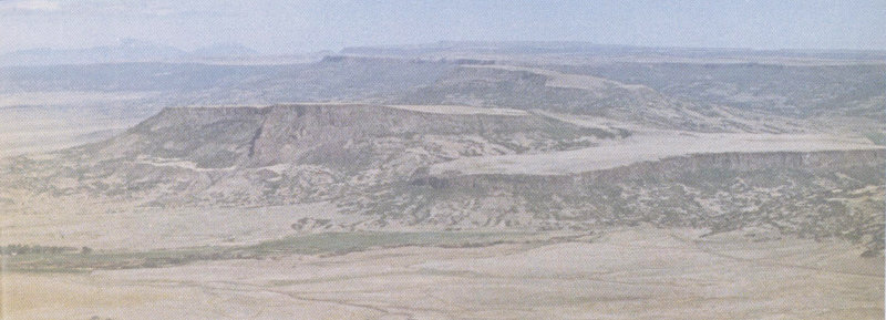 Figure 29.—Pawnee Buttes in northeastern Colorado. Buttes isolated by erosion from High Plains in the background. Ogallala Formation caps top of Buttes. White River Group forms lower part. The top of the highest butte is about 240 feet above the saddle between the two buttes. Photograph by R. D. Miller, U. S. Geological Survey.