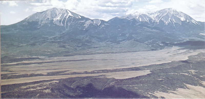 Figure 14.—Spanish Peaks, southwest of Walsenburg, Colo. Igneous rocks and many radiating dikes exposed by erosion. Photograph by R. B. Taylor, U.S. Geological Survey.