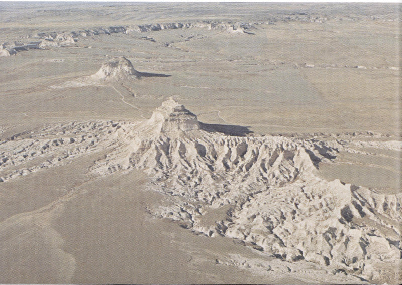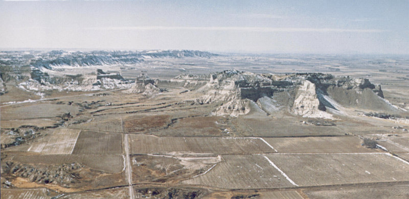 Figure 16.—Aerial view of Scotts Bluff National Monument, Nebr. Buttes on the south side of the valley of the North Platte River isolated by erosion from High Plains in the background. Highest butte stands about 800 feet above valley floor.