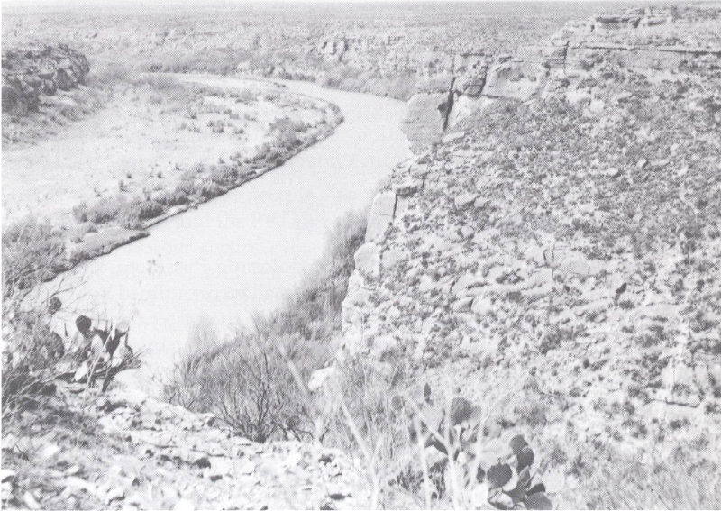 Figure 30.—Rio Grande and the flat-lying limestone layers of the Edwards Plateau downstream from the mouth of the Pecos River. Mexico on the left side of picture. Photograph by V. L. Freeman, U. S. Geological Survey.