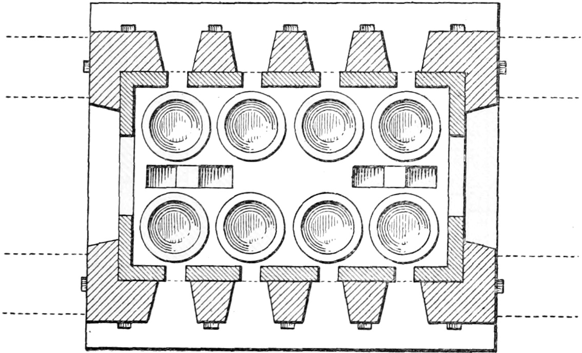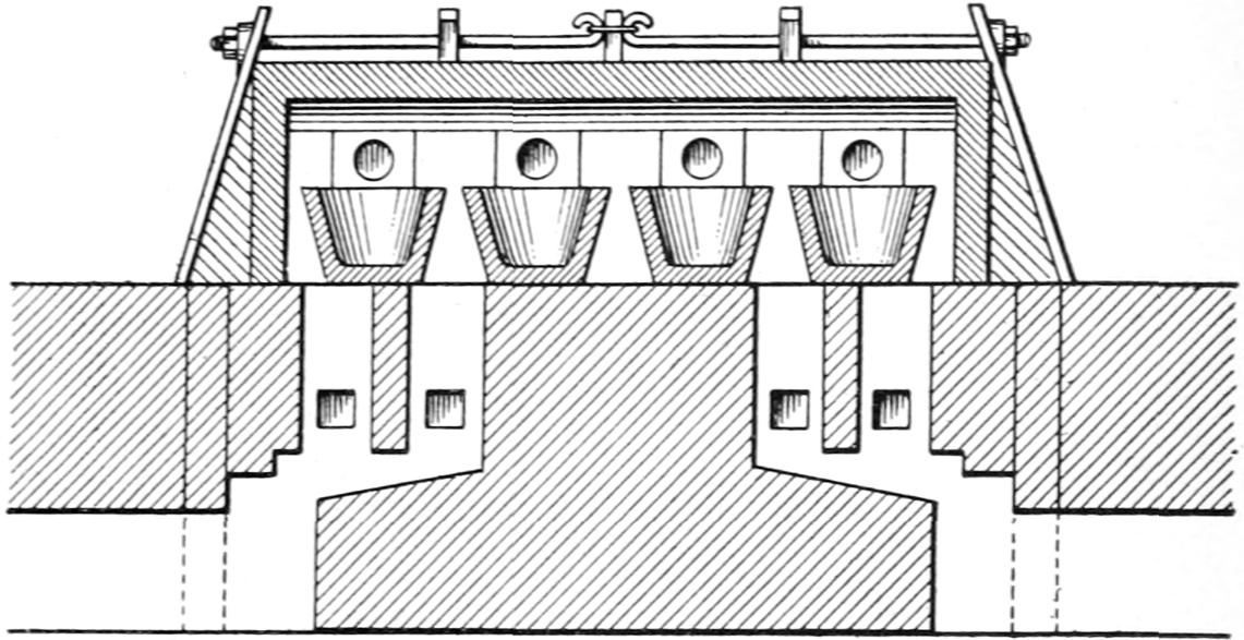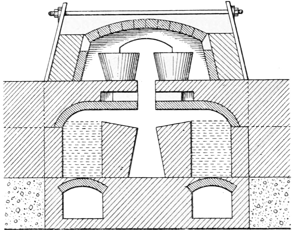 In many English glass works, especially those in the Stourbridge district, it is the practice to fill the pots on a Saturday morning and take until the following Monday night to melt and plain the glass, no glassware being made for three days of each week. Starting on 119Monday night or Tuesday morning, the glass makers work in six hour shifts day and night until Friday night or Saturday morning, when the pots are again filled and the weekly course starts over again. Abroad the pots are filled nightly and hold just sufficient metal to last out the work during the day, and are built of a capacity to suit the articles being made. The disadvantages of our method are obvious when a comparison is made with the continental method of melting the glass nightly and working it out daily, especially when the efficiency or output of the furnaces as compared with their fuel consumption is taken into consideration.