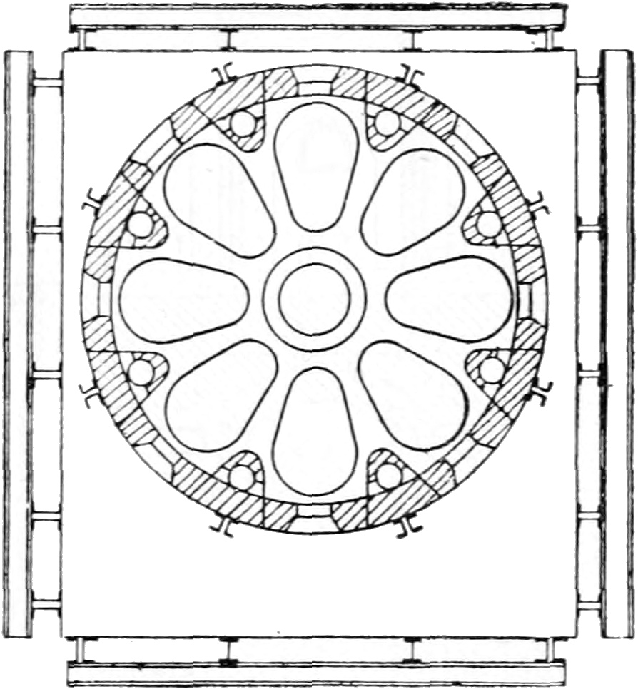 This table is a level iron bench the size of the plate to be cast, the face of which consists of thick sheets of iron plate riveted together to form a level top; along the whole length of each side of this table is a raised flange of a height sufficient to give the thickness of the plate of glass to be cast: resting on these two outer 94edges a long, heavy metal roller runs, covering the full width of the table. The crucible of hot metal is brought to a convenient position and the contents poured out on the table in front of the metal rollers. These rollers then travel along and squeeze or roll out the hot metal over the surface of the table to the thickness regulated by the side pieces, which also prevent the metal from flowing over the sides. The empty crucible is then conveyed back to the furnace for refilling.