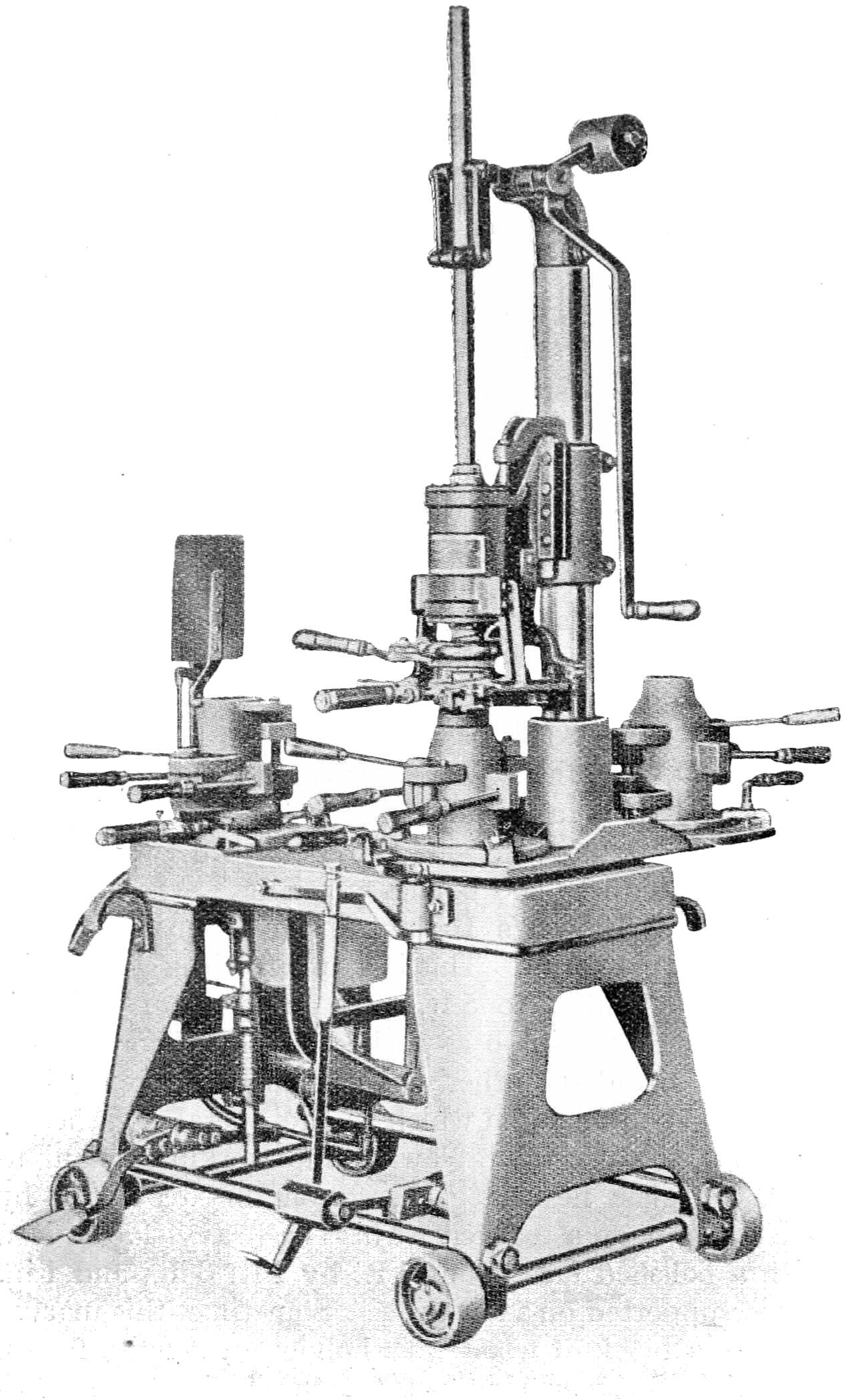An automatic machine for grinding, smoothing, and polishing the bottoms of tumblers, etc., “bottoms” or grinds, smooths, and polishes tumblers at the rate of 2,000 a day. Four vertical revolving wheels are fixed within a frame, one iron, two stone, and one wood. Over each of these is a rotating spindle carrying the tumbler so that the bottom of it is automatically pressed against each vertical wheel in turn. The first wheel does the roughing, the two next the smoothing, and the fourth the polishing. These machines are simple and require only unskilled labour to operate, and go far towards cheapening production.