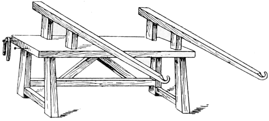 The cap of the cylinder at the blow-iron end is now cracked off. A thread of hot glass is wrapped round the shoulder near the cap, and the line chilled by using a curved, hook-shaped rod of iron. Whilst the cap is being cracked off, the cylinder is allowed to rest supported by a wooden cradle.