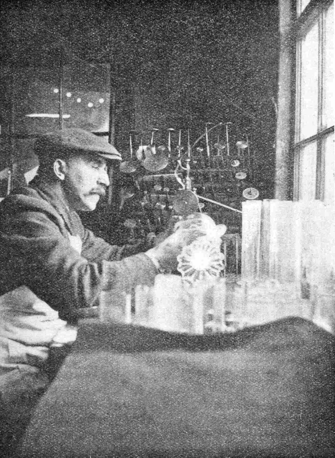 The cylinder is now open at both ends (f) and is taken to the flattening kiln or furnace. This kiln has a level, smooth floor, heated from below, upon which the cylinders are flattened out. Placing the cylinder on the floor in front of him, the workman places along the inside length of the cylinder a long red-hot iron rod touching the glass, and then chills the line with a touch from a cold iron rod. This causes a split to take place along the whole length of the cylinder. As these cylinders are split open, they are removed to a hotter zone within the flattening kiln, where the heat causes the cylinder to uncurl and gradually flatten out.