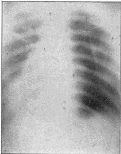 208. Norton’s Experiment. Diagnosis. Elect. World, N.Y., May 23, ’96.—In conjunction with Dr. Francis H. Williams, Dr. Norton examined several patients from the city hospital to determine how an X-ray diagnosis would agree with that previously made by the hospital staff. (See also § 142, at end.) The outline of an enlarged liver, 7 inches in diameter, was easily distinguished, the two outlines, one by percussion and one by X-rays, agreeing better in favor of the latter by 1/2 inch. An enlarged spleen was perfectly outlined. The tuberculosis of one lung caused it to be more opaque than the sound lung. It was found necessary to take into account the seams of clothing, buttons, buckles, etc. A bullet was found exactly under the spot which they marked as being over the bullet. A foreign metallic body can be easily detected in the œsophagus, because the latter is quite transparent. They could see the shadows of the cartilaginous rings in the trachea, glottis, and epiglottis. Younger persons, up to 10 years of age, are more transparent than older.
