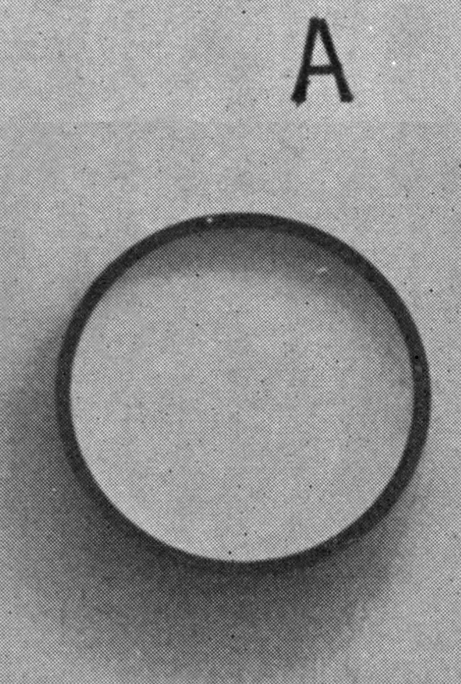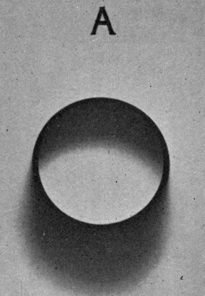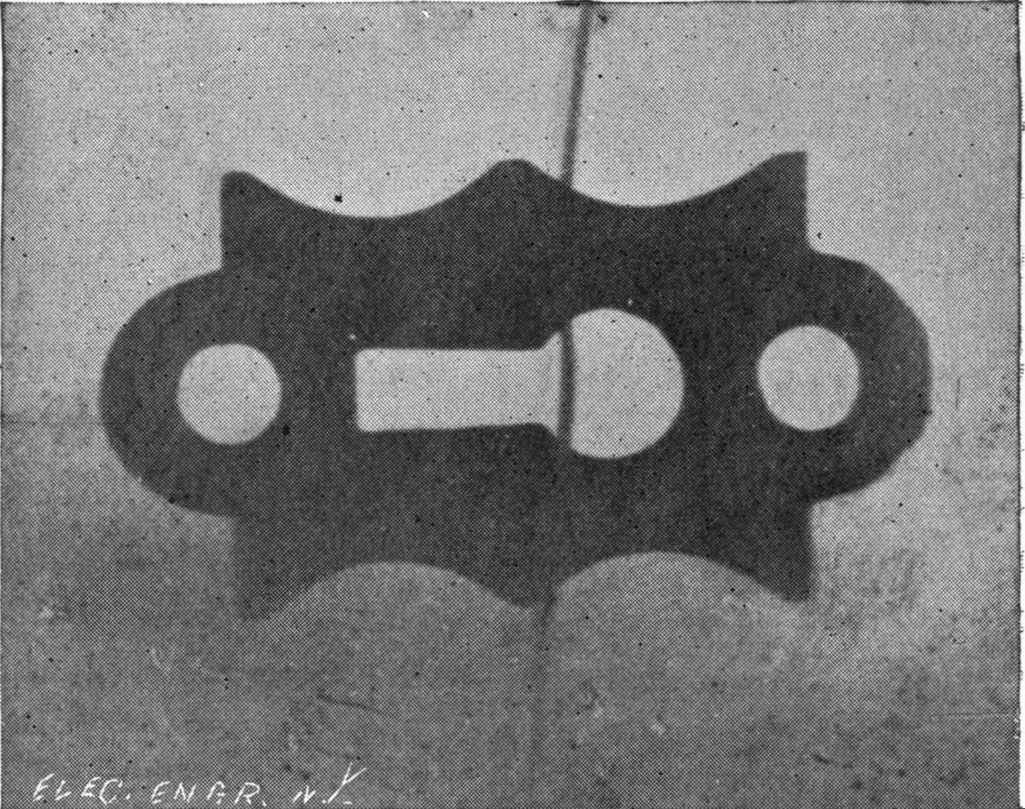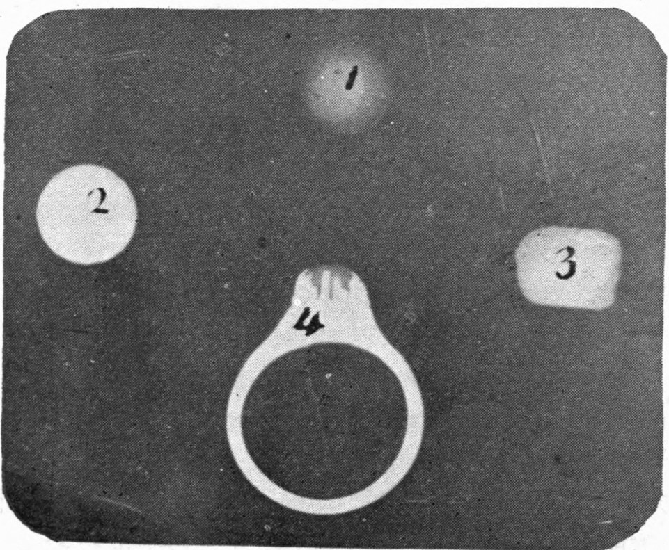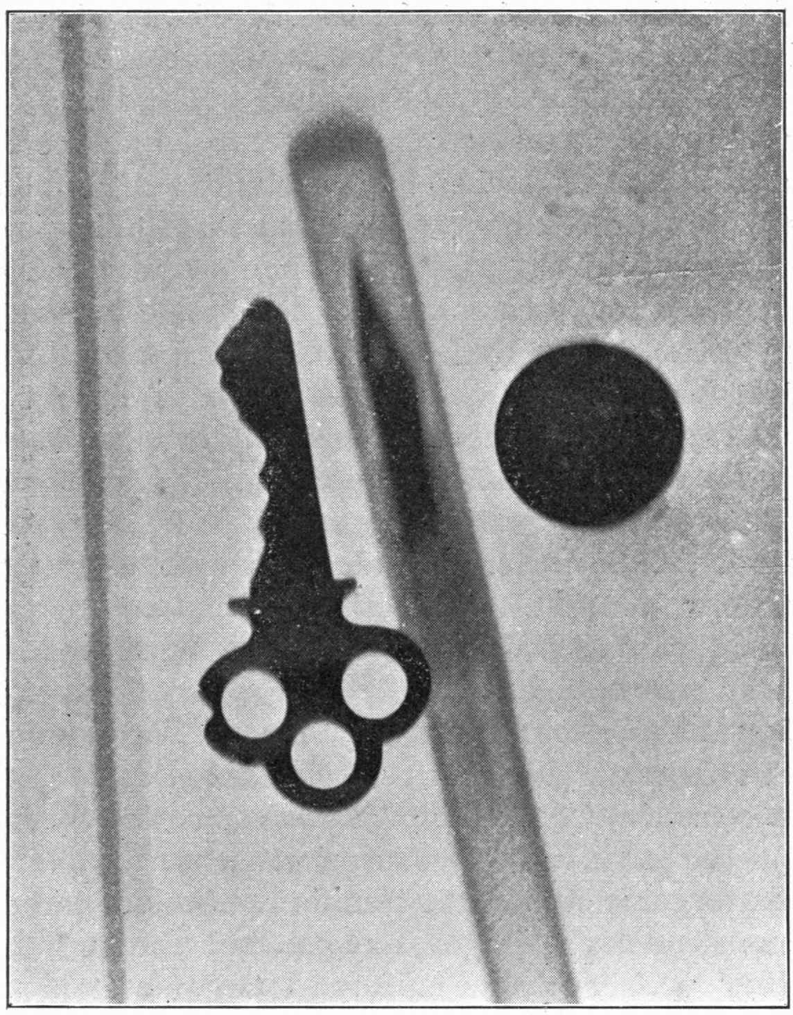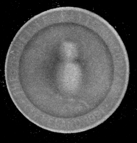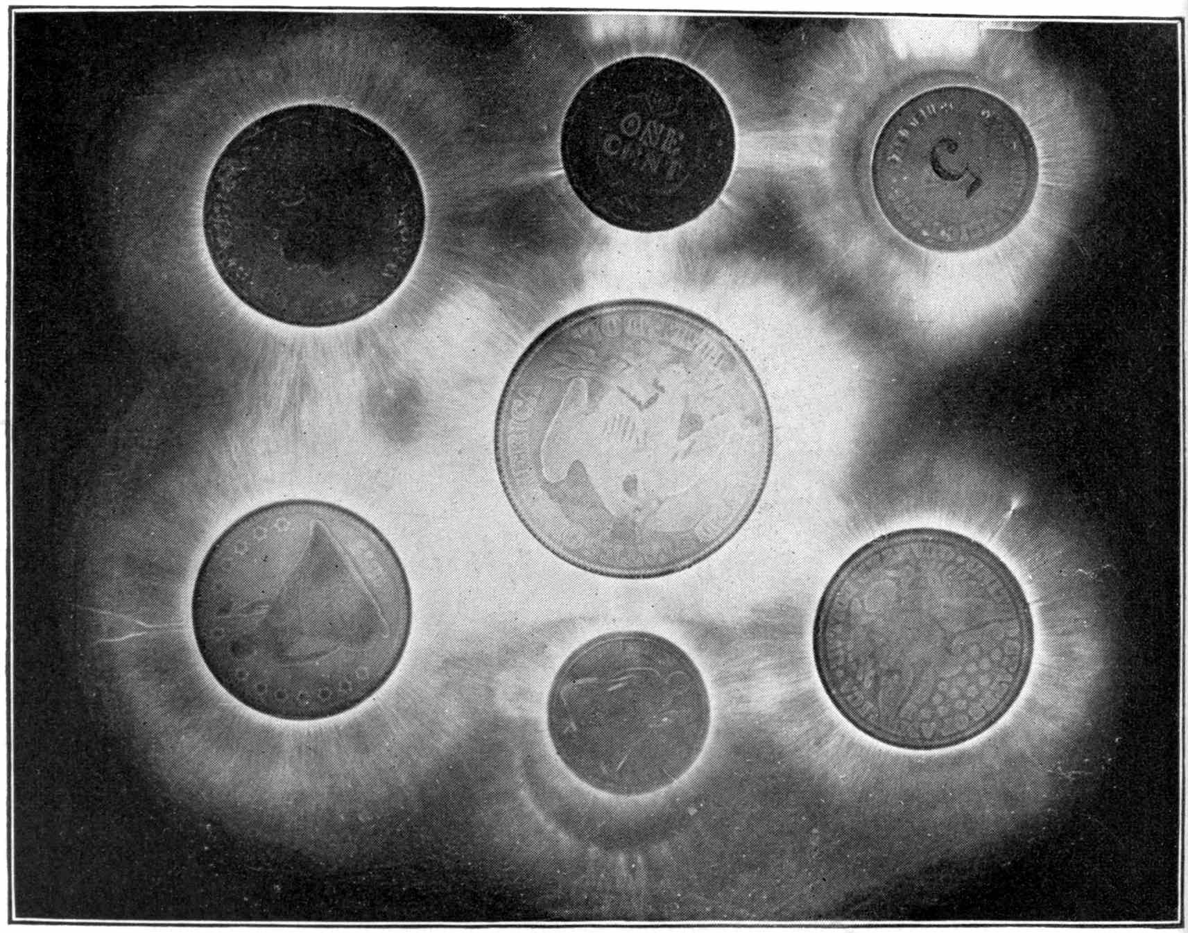 159. Carpentier’s Experiment. Sciagraph Showing the Parts in Relief on a Coin. Comptes Rendus, Mar. 2, ’96. From trans. by Louis M. Pignolet. An imprint of a coin stamped upon a thin piece of well annealed aluminum by pressing the coin against the aluminum, was reproduced in a sciagraph. The raised parts of the coin were scarcely 8/100 of a millimeter high. The aluminum was 5/10 millimeter thick. This result is admirably represented by the sciagraph of an aluminum medal on page 166, taken by Prof. Dayton C. Miller, of Case School of Applied Science, Elect. World, N.Y., Mar. 21, ’96, who also made a sciagraph of a copper plate 1/4 inch thick having blow holes which appeared in the picture, but they could not be detected by light, serving to illustrate an application of the new discovery in testing the homogeneity of metals.