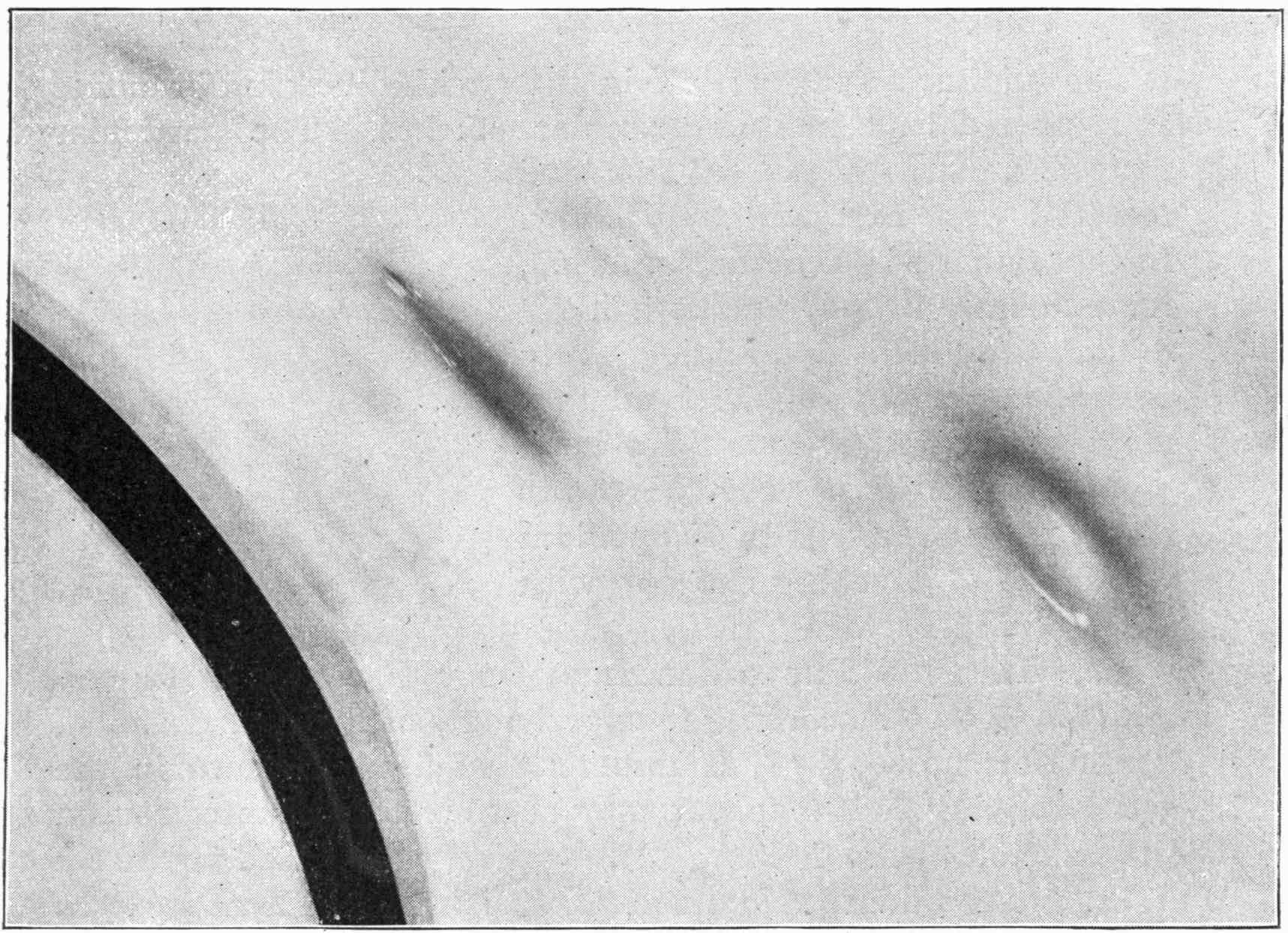 203. Miller’s Experiments. Location of Bullets. Elect. World, Mar. 21, ’96.—Bullets were clearly located in the hands of two different men by Prof. Dayton C. Miller, of the Case School of Applied Science. In one, the bullet had been lodged for 14 years and had always been thought to lie between the bones of the forearm, but two sciagraphs from different directions located the ball at the base of the little finger. By means 175of five sciagraphs from different directions, the ball in the other hand was located at the base of the thumb.